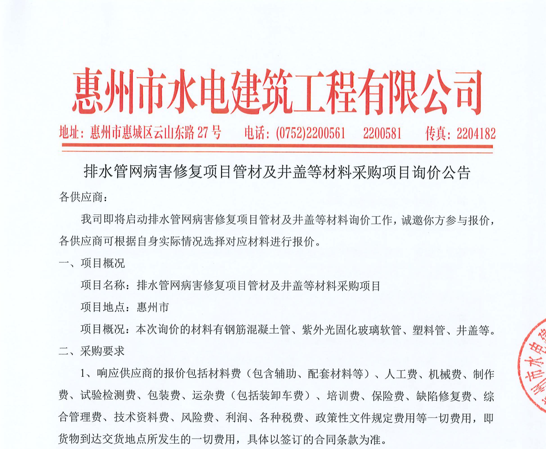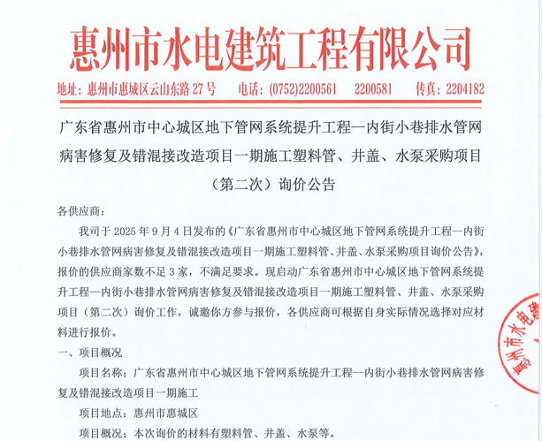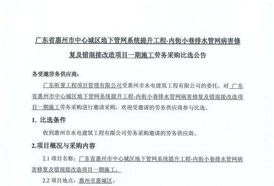 廣東省惠州市中心城區(qū)地下管網(wǎng)系統(tǒng)提升工程-內(nèi)街小巷排水管網(wǎng)病害修復(fù)及錯(cuò)混接改造項(xiàng)目一期施工勞務(wù)采購(第二次)中選候選人公示……